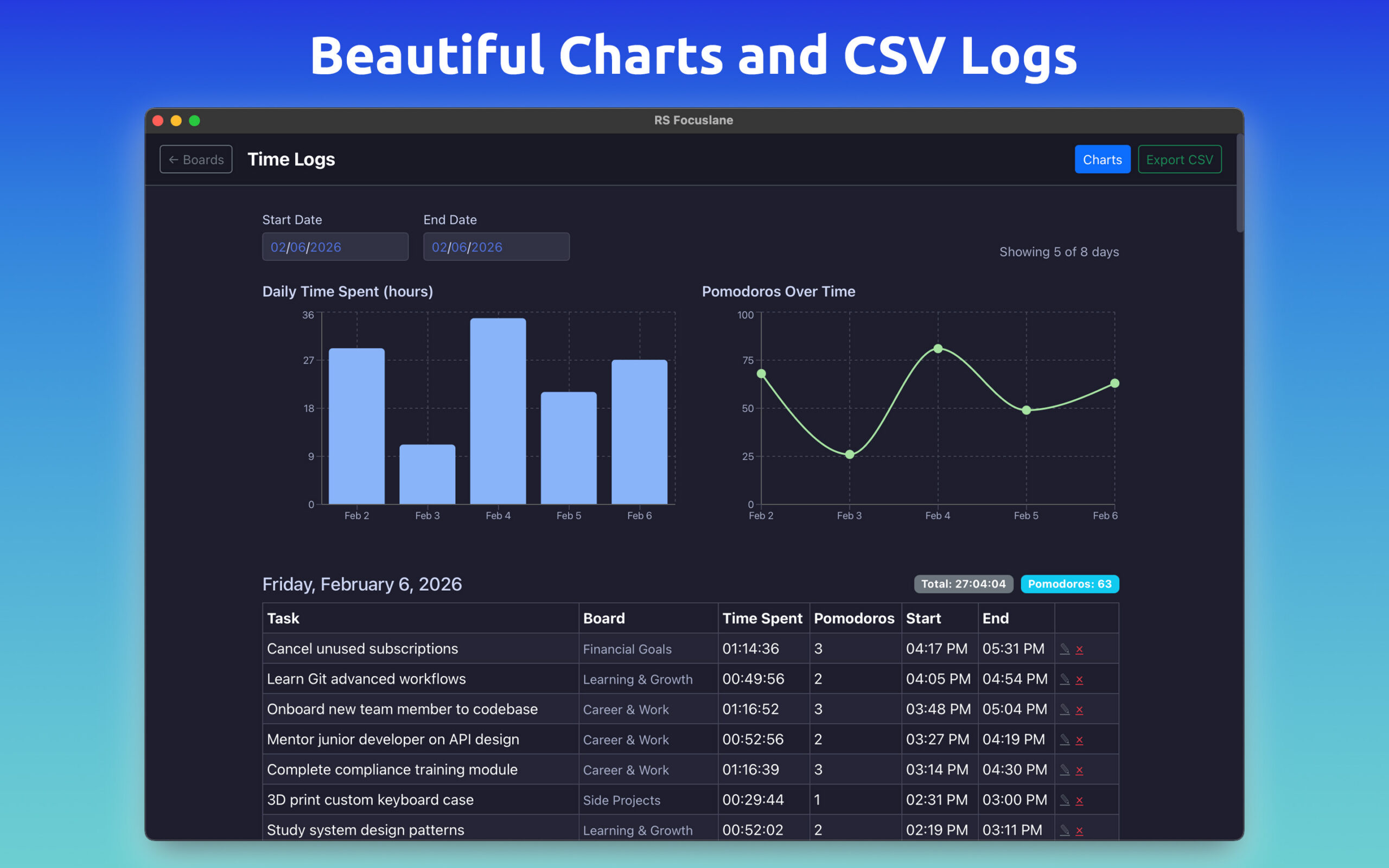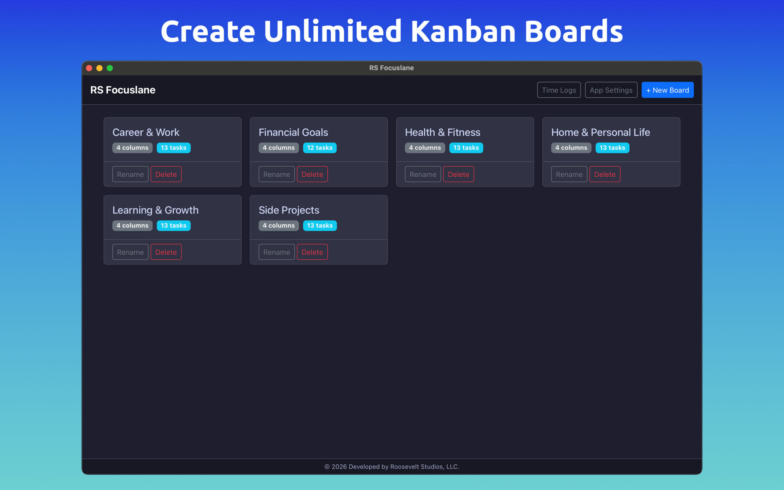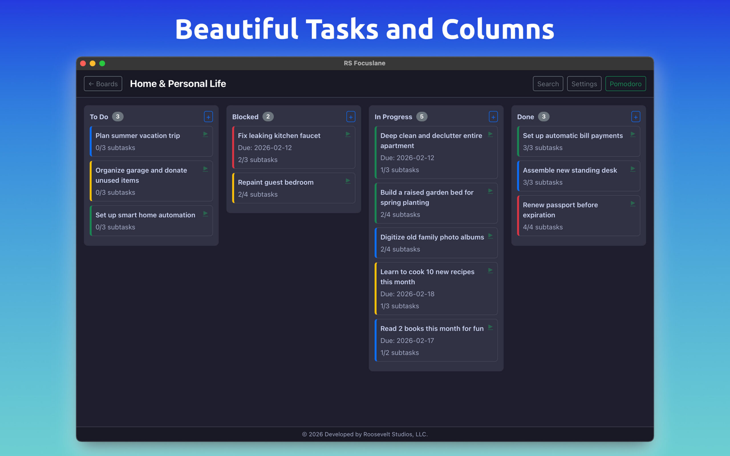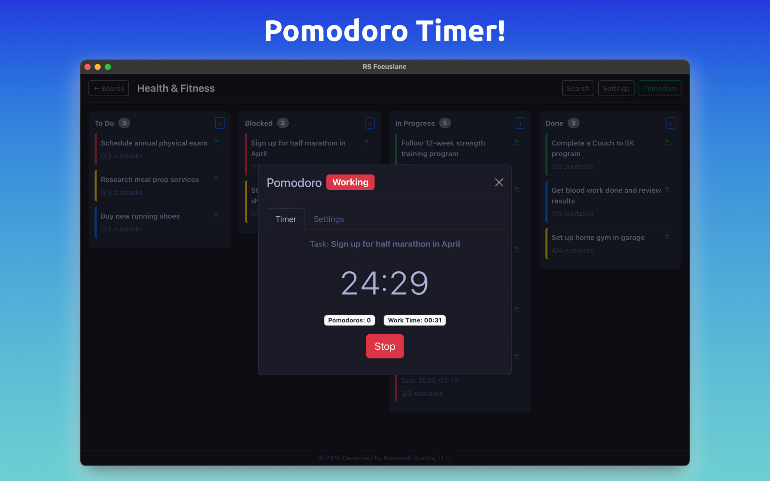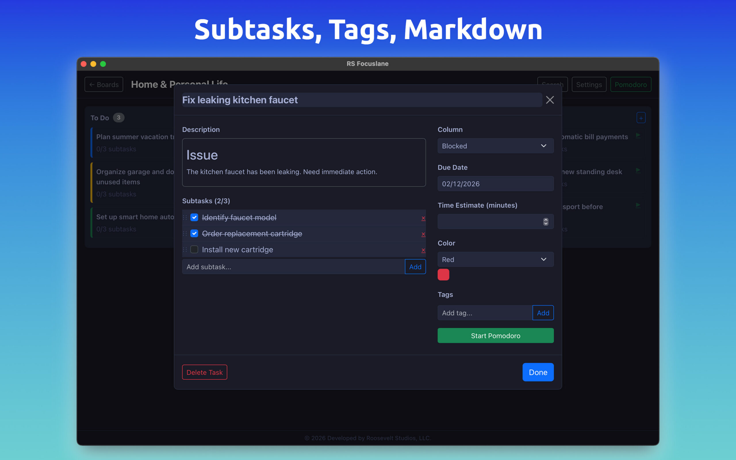 ✅ Unlimited Boards, Columns and Tasks✅ Pomodoro Timer✅ Create Subtasks, Tags, and Card Colors✅ Markdown Text Editor✅ Beautiful Charts and CSV Export✅ Customize UI & Colors